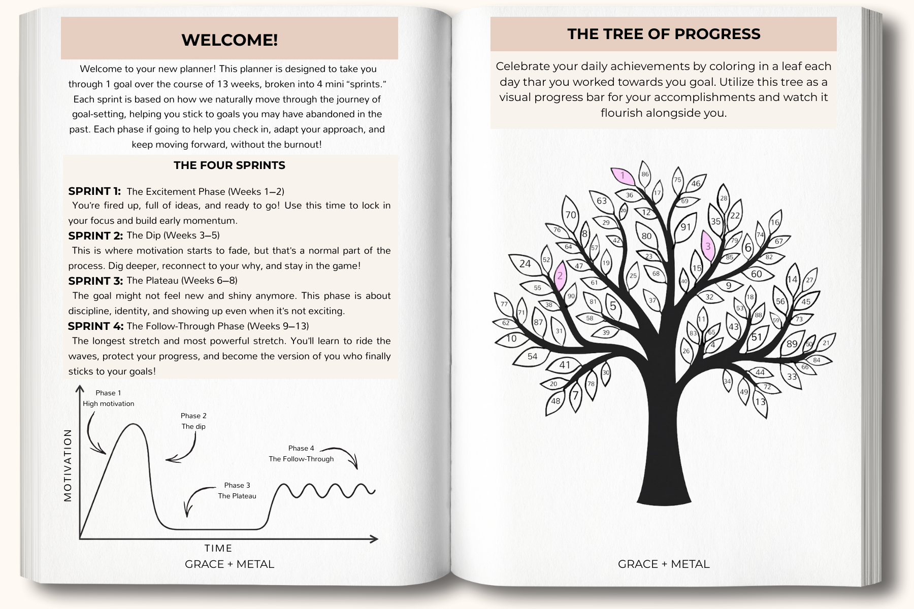 This 90-day planner is designed with psychology-backed prompts, four motivational sprints, and a unique progress-tracking tree that keeps you focused, consistent, and inspired. Instead of juggling ten goals, you’ll lock in on one, break it into achievable steps, and actually see results. With daily check-ins, countdowns, and weekly reflections, this planner doesn’t just organize your life - it rewires the way you stay accountable. Minimal, motivational, and made for real people who are ready for real progress.